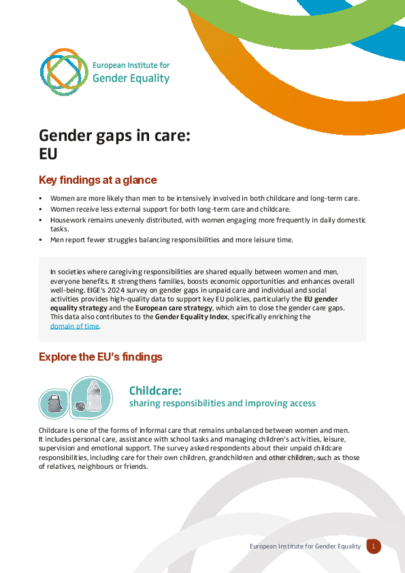 The second wave of EIGE’s EU-wide survey on gender gaps in unpaid care and individual and social activities (CARE Survey) provides updated and comparable data on how women and men across the EU organise and experience unpaid care, housework, the use of informal and formal care services, and their leisure time. Conducted in 2024 across all 27 EU Member States...